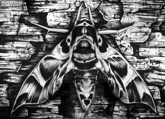 どこにいるのかわからないレベルで蛾に擬態しきっている女性のボディーペインティング。Paul Roustanによる作品だそうでモチーフはパンドラスフィンクスという蛾だそうです。